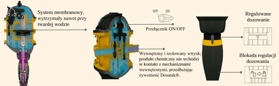Dosatak to urządzenie do dozowania leków, szczepionek, witamin i innych płynów poprzez wodę dla zwierząt hodowlanych. Dosatak jest odpowiedni do trudnych warunków hodowli drobiu, wykonany z wysokiej jakości materiałów, posiada system membranowy, który zwiększa trwałość i wymaga mniej konserwacji, nawet w obecności twardej wody.